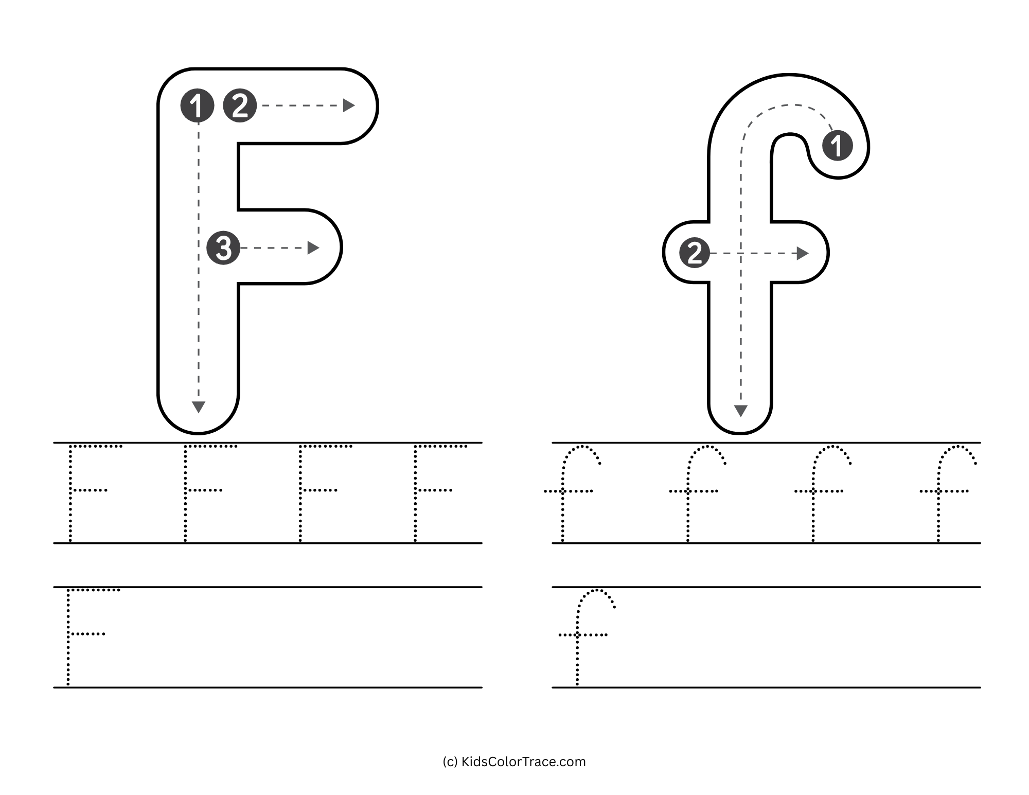 - Uppercase and Lowercase ‘F’ Tracing: Dotted lines guide children on how to form both the capital ‘F’ and the lowercase ‘f’, helping them practice the correct stroke order.
